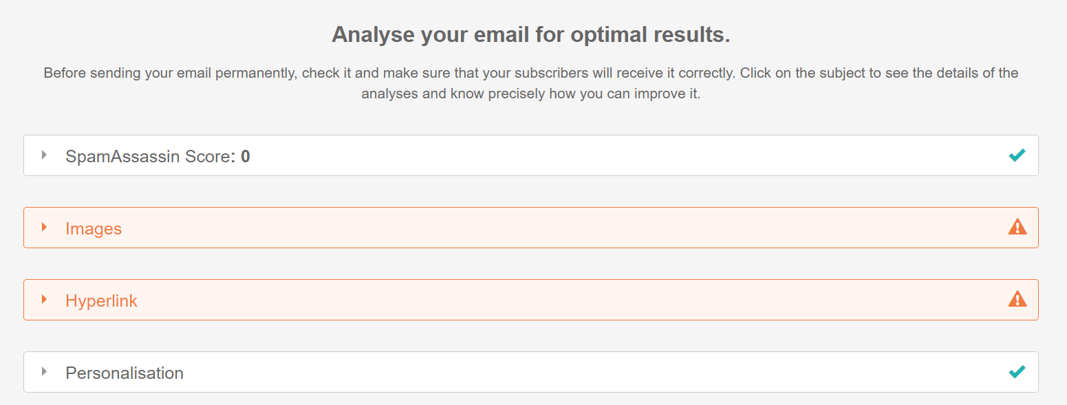 Do you want to know what the spam score of your email is and whether your hyperlinks are working properly? You can check this and more in the mail analysis.