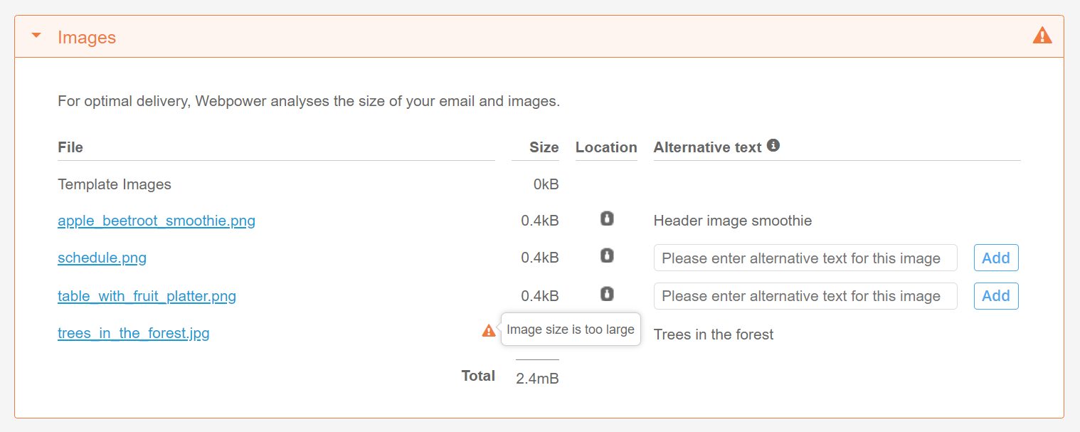 Here you can see how large the images are in KB. Try to keep your images under 100 KB per image. The smaller the images in an email, the faster it will be loaded for the recipient. Large images also take up a lot of data from recipients with a mobile data plan.