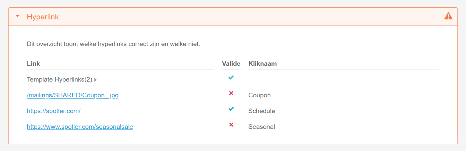It is useful to check the hyperlinks. When you see a red cross, one of the links in your email is broken. In addition, you will see the name of the link under Clickname. Check whether it has been filled in and is correct. Clicks are only measured in the statistics if they have a clickname. Links with identical clicknames will be grouped together in the statistics.