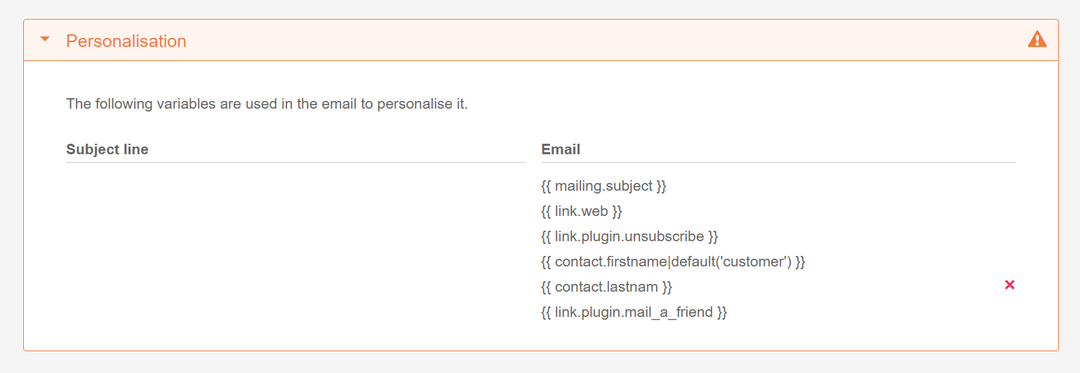 In the personalisation section, you can see which variables are used in your email. If a variable doesn't work, a red cross will show up next to it. So, in this example, contact.lastnam is an incorrect variable.