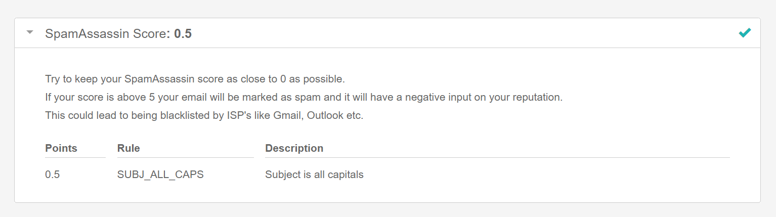 Try to keep the score of the SpamAssassin as low as possible. You can do this by avoiding unnecessary capital letters or strange characters in your e-mail. Try to avoid trigger words like "urgent" and "100% free". Make sure your email has a good balance between text and images.