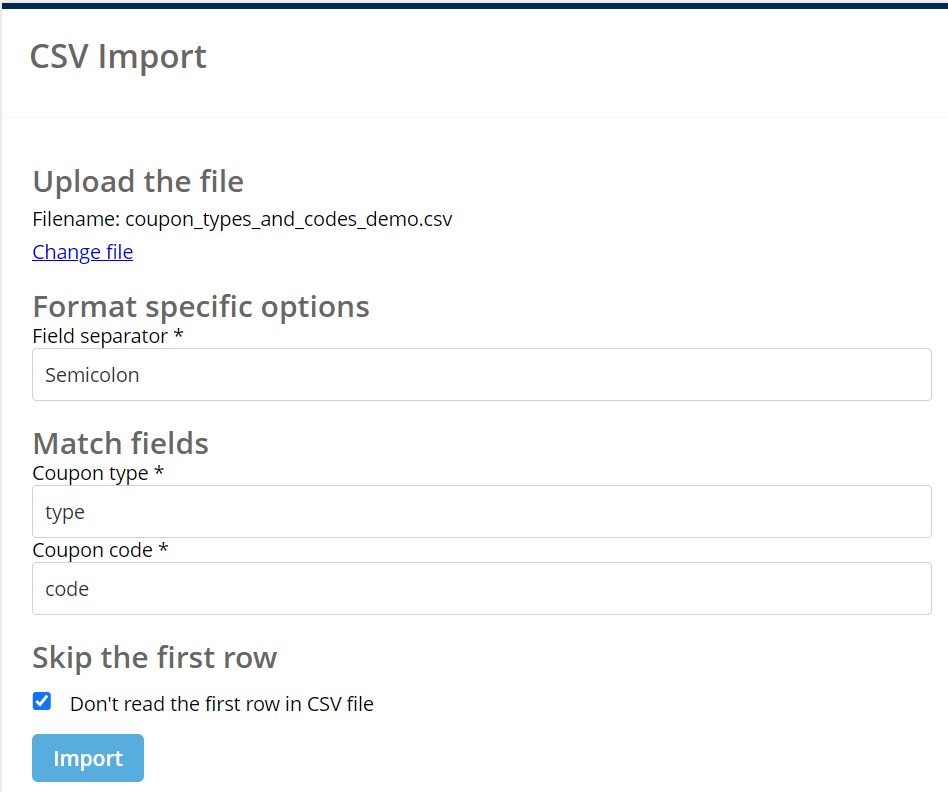 With the Import button, you upload a CSV-file with codes of one type. This way, you can upload an entire list of codes at once. This process works the same as previously described, except that you choose only one coupon type from the dropdown, instead of matching the type to a field from the CSV file.