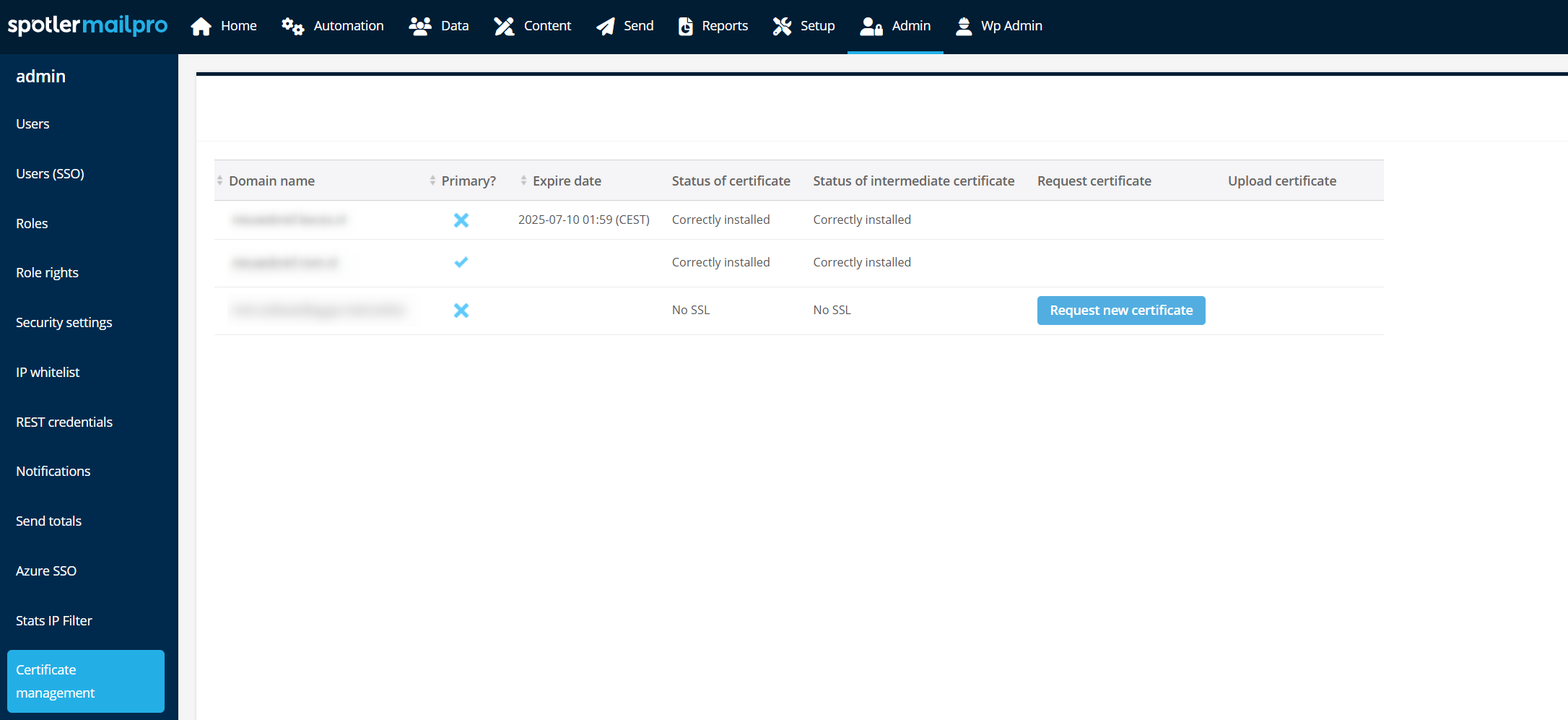 By default, our system administrators automatically arrange Let's Encrypt certificates for the local domains in the license. If you prefer to use your own SSL certificate, please contact your account manager or email sales@spotler.com so that the Certificate Management functionality can be activated for you.