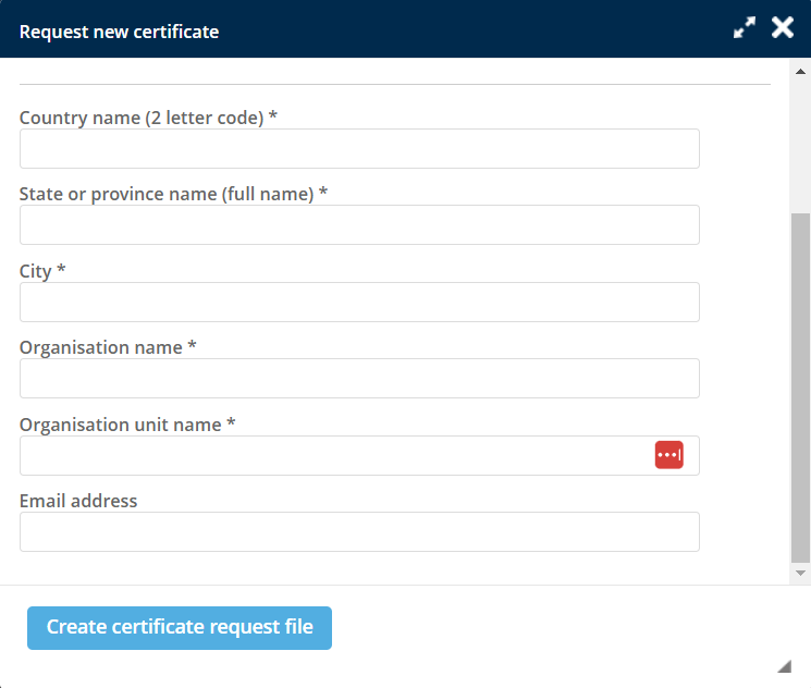 Click the Request new certificate button. A screen with a form will open. In this form, fill in the data for the CSR file. Once you have filled in the form, click on the Create certificate request file button. The CSR file will now be downloaded.