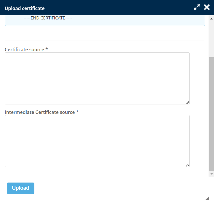 Submit the CSR file to the party that issues your SSL certificates, to request the SSL certificate. Once you have obtained the SSL certificate, upload it to the Certificate Management. Click Upload certificate. A screen will open in which you fill in the details of the SSL certificate.