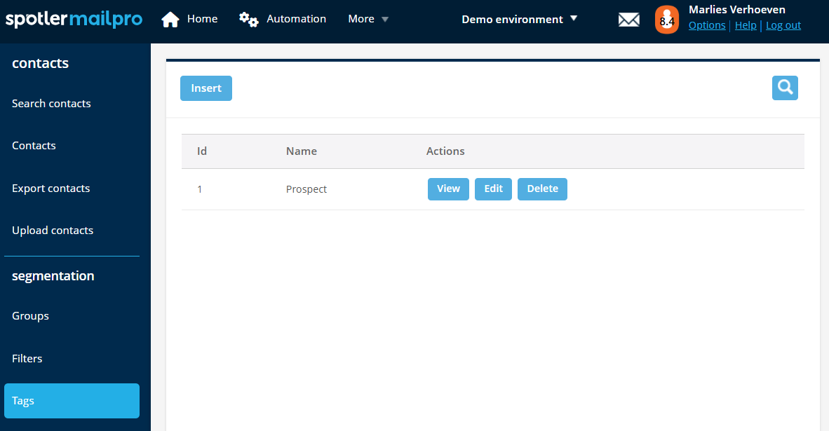 On this page, you first find the button to insert a new tag. In the overview you first find the Id of added tags, the name of the tag and actions, which are View, Edit and Delete.