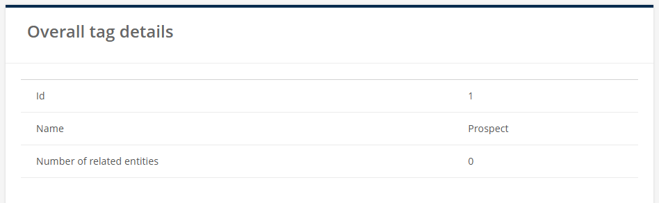 View: You go to the screen 'Overall tag details'. Here you can find a scheme with the Id of the tag, the tag name and the number of related entities.
