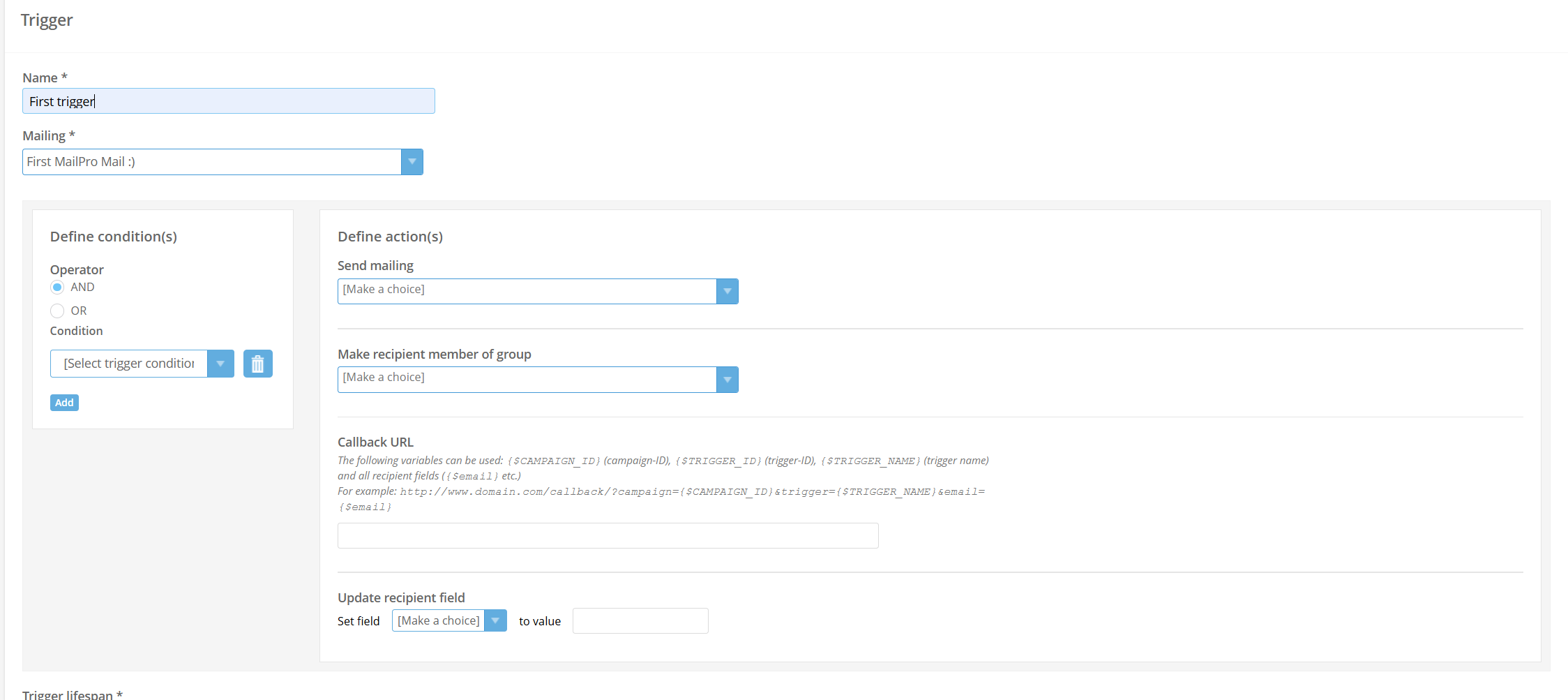 In the trigger settings, you’ll see two sections: Define condition(s) and Define action(s). Start by defining the condition(s). These determine when the trigger will be activated. Common examples include: