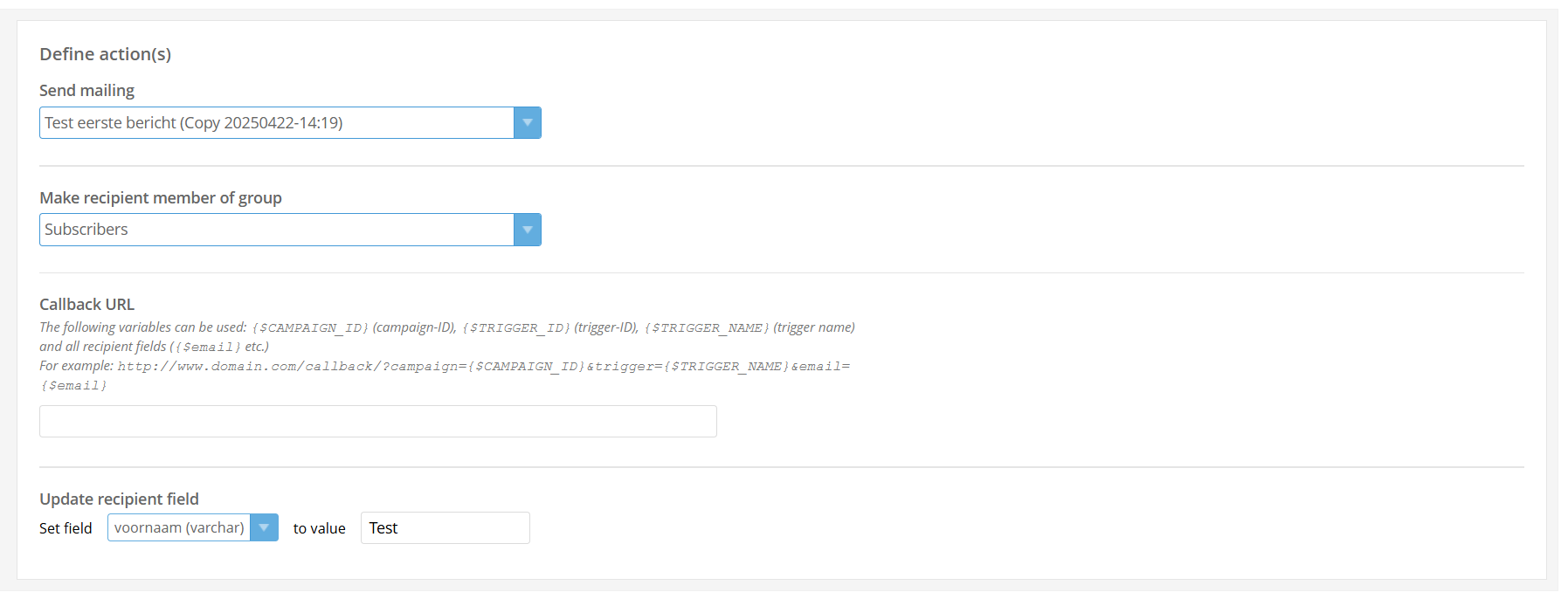 - Callback URL: Create a callback to, for example, a website. Variables from the contact will be included in the request.