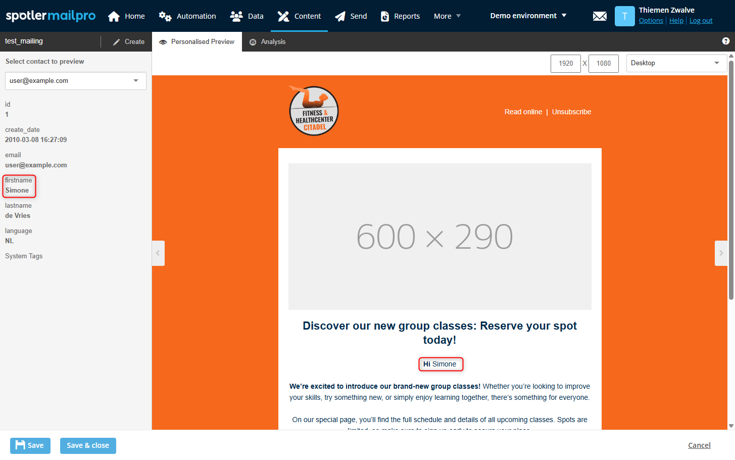 When you are working on the message in the editor, you can easily check whether personalisation is applied correctly. Go to the Personalised Preview tab. To test personalisation, select a contact from the test group at the top left of the editor for a preview. In the example below, you can see that Simone is used as personalisation.