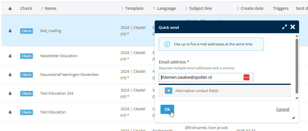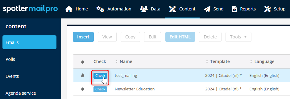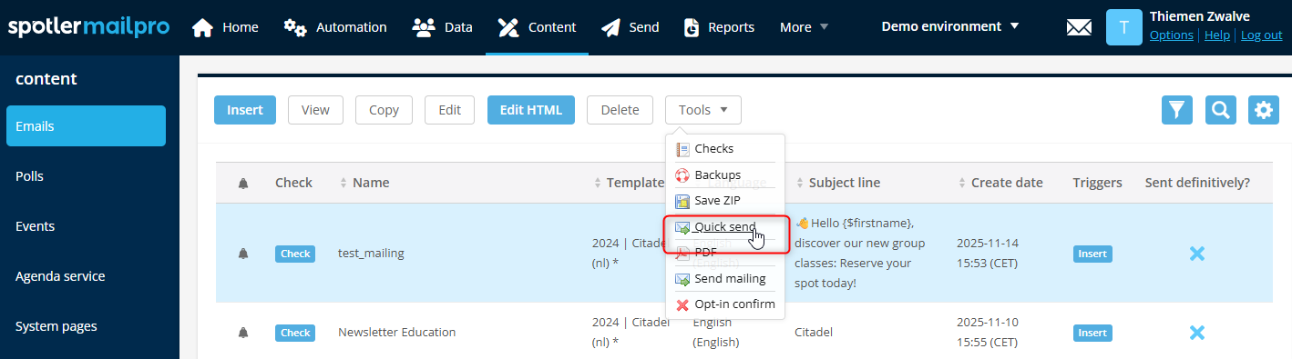 This method allows you to quickly send a message to an email address to test it in the mailbox. Go to the Content module and select the email you want to test; it will now be highlighted in blue in the overview. Then click Tools and then Quick send.