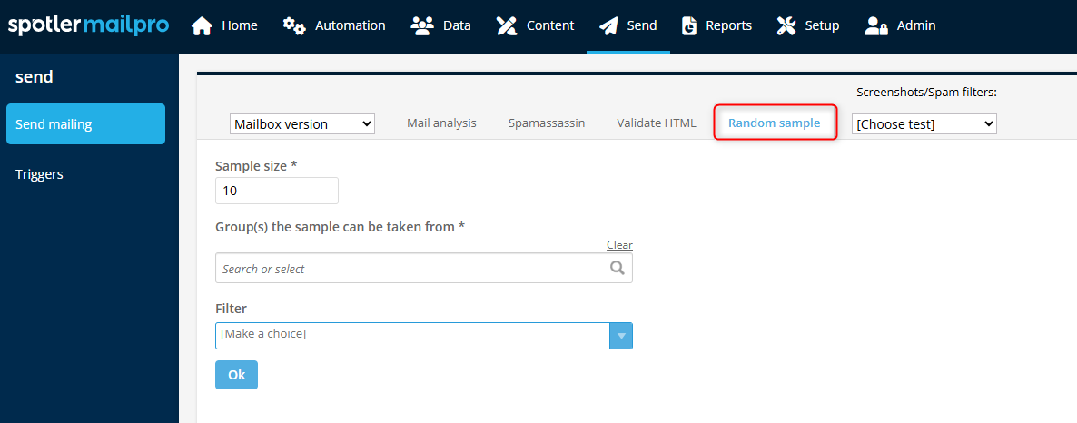 Finally, you can view an analysis of the mailing, the spam score, an overview of the HTML, and you can perform a Random sample test that is personalised. You can choose contacts from a specific group that meet certain filters.