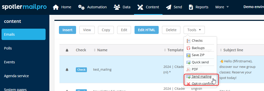 The most comprehensive way to test is to send the mailing to a test group. In this case as well, select the email you want to test in the Content module so it is highlighted in blue in the overview. Click Tools and then Send mailing.