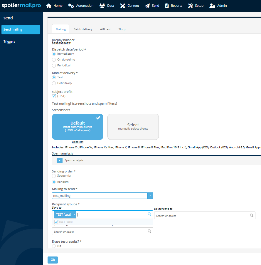 If you want to see how the email will appear in different clients, you can select the Default option under Screenshots. Then you can send the mailing to the selected test group.