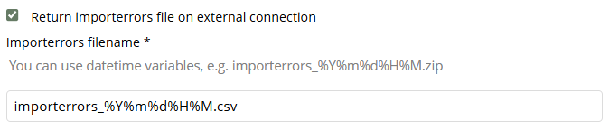 To use this functionality, configure both the return option in the import and a result path in the external connection. Error files can include dynamic naming, such as timestamps, to support tracking.