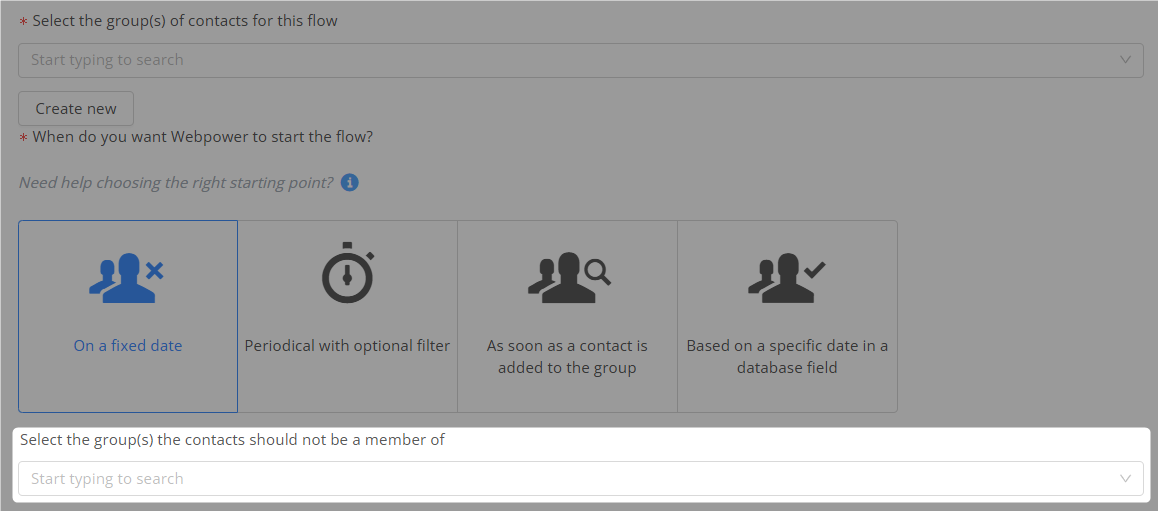 A “Not in group” option has been added to flow start steps. This allows contacts to be excluded before the flow starts.