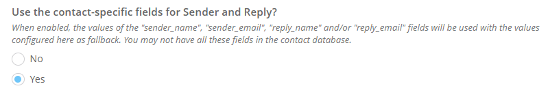 Previously, these fields were always used when available. You can now choose per mailing whether to use these contact-level fields or the default sender configured in the mailing.