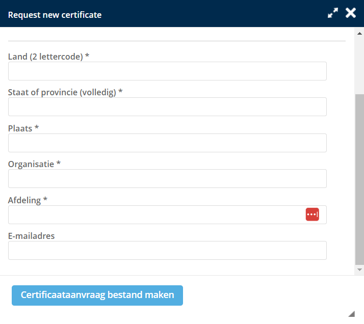 Klik op de knop Nieuw certificaat aanvragen. Er opent een scherm met een formulier. In dit formulier vul je de gegevens voor het CSR-bestand in. De CSR (Certificate Signing Request) is nodig om een nieuw SSL-certificaat aan te vragen.