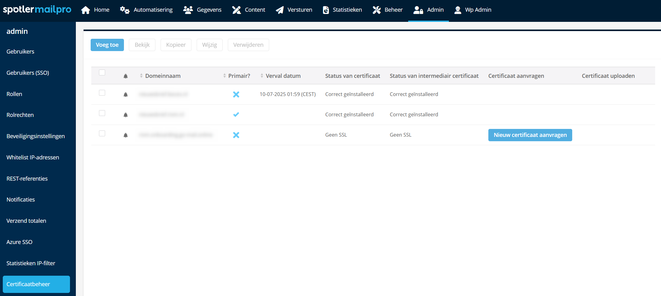 Standaard regelen onze systeembeheerders automatisch al Let's Encrypt certificaten voor de lokale domeinen in de licentie. Maak je liever gebruik van een eigen SSL-certificaat, neem dan contact op met je accountmanager of mail naar sales@spotler.com, zodat de functionaliteit Certificaatbeheer voor jou geactiveerd kan worden.