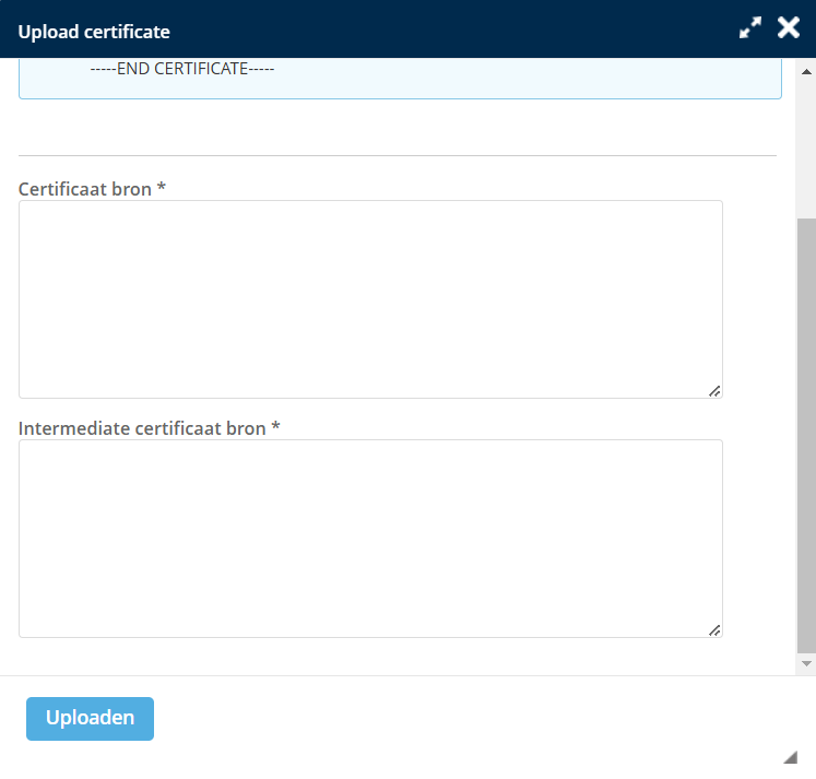 Het certificaat dat je ontvangen hebt, bestaat uit een certificate source en een intermediate certificate source. Open de certificate source en kopieer de gehele tekst in het tekstveld, inclusief de beginregel en eindregel. Deze herken je aan: