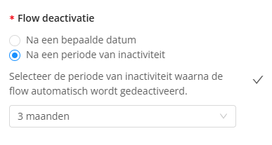 - Flow deactivatie na periode van inactiviteit kan ingesteld met verschillende termijnen. Het standaard minimum is 3 maanden na laatste activiteit, het maximum is 2 jaar na laatste activiteit