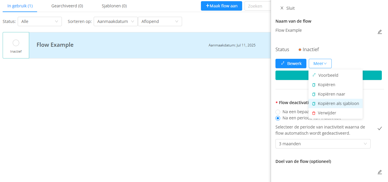 Van bestaande flows kan je nu eenvoudig een sjabloon maken. Hierdoor kan je een al bestaande flow als basis gebruiken voor een nieuwe flow. Je kan een flow via Meer klikken op Kopiëren als sjabloon, de kopie van de flow wordt vervolgens opgeslagen in de tab Sjablonen.