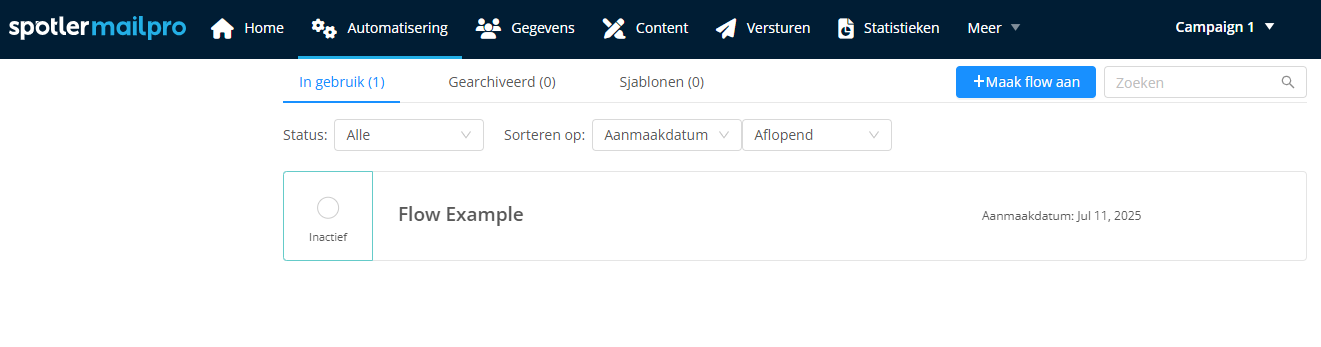 Als je op de Automatiseringen klikt, vind je bovenaan de pagina drie nieuwe tabs. In gebruik, Gearchiveerd en Sjablonen. Bij In gebruik vind je alle flows die op dit moment actief of inactief zijn. Binnen de tab Gearchiveerd vind je alle flows die gearchiveerd zijn. Binnen de tab Sjablonen vind je alle flows die je als sjabloon hebt opgeslagen voor later gebruik.