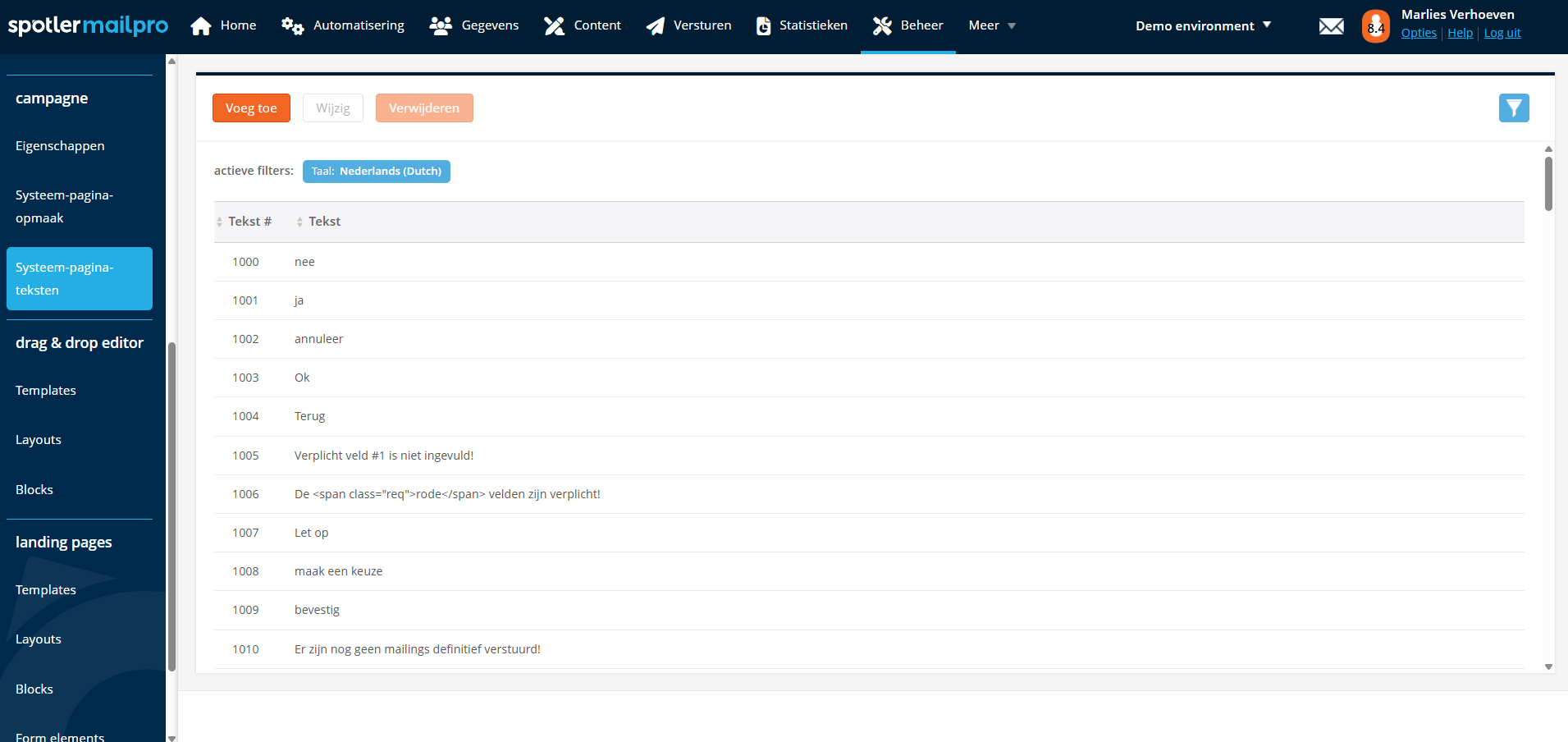 Heb je meerdere talen geactiveerd binnen je campagne, dan kun je via het filtericoon systeem-pagina-teksten per taal bekijken. Je moet iedere taal handmatig aanpassen. Er is geen automatische vertaalfunctie. Pas eerst taal 1 aan, wijzig vervolgens het filter naar taal 2, en doe daar je tweede aanpassing.