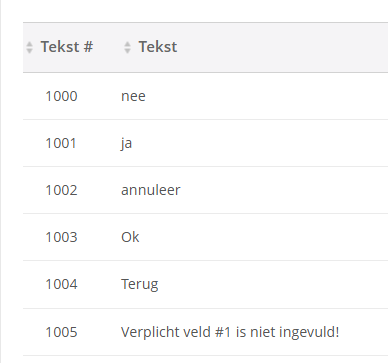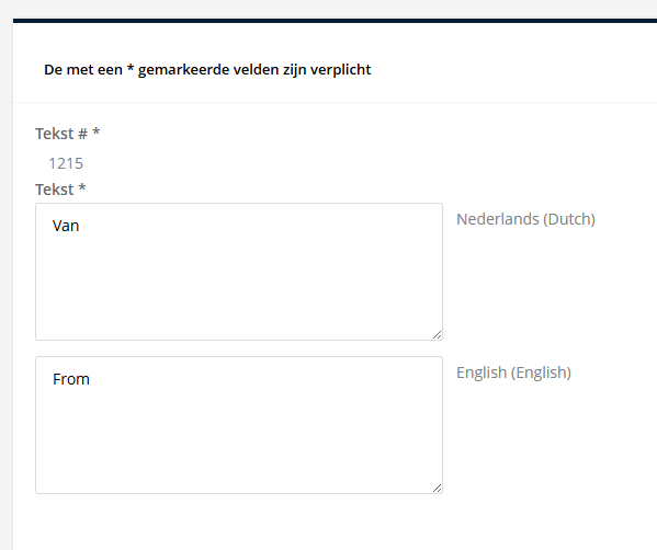 - Tekst #: Het unieke ID van de tekst. Dit ID wordt gebruikt op systeem-pagina’s. Als je een label op een pagina ziet, kun je het ID gebruiken om de juiste tekst terug te vinden en aan te passen.