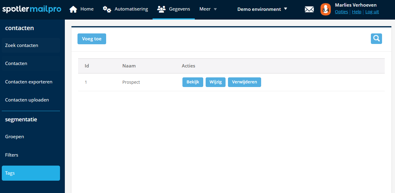 Op deze pagina vind je de knop Voeg toe om een nieuwe tag in te voegen. In het overzicht zie je het Id van de toegevoegde tags, de naam van de tag en acties: Bekijk, Wijzig en Verwijderen.