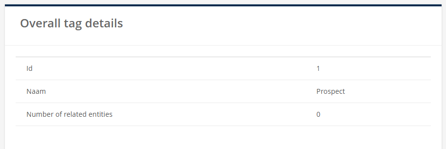 Bekijk: Je gaat naar het scherm ‘Tagdetails’. Hier vind je een overzicht met het Id van de tag, de tagnaam en het aantal gerelateerde entiteiten.