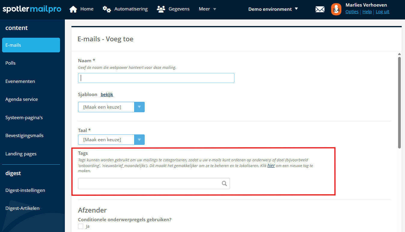 Bij het aanmaken van een nieuwe e-mail kun je tijdens de instelfase een tag toevoegen. In deze fase configureer je de berichtnaam, template en onderwerpregel. Hier vind je ook de optie om een bestaande tag te selecteren of een nieuwe aan te maken.
