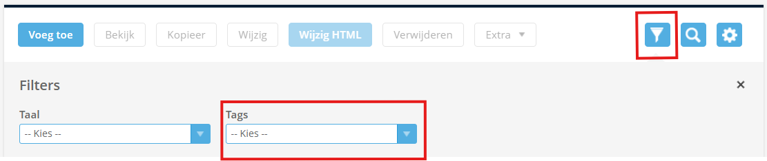 Nadat tags zijn toegepast, kun je ze gebruiken om mailings te filteren in het e-mailoverzicht. Klik op het filtericoon om het filtermenu te openen. In dit menu selecteer je een tag om alleen de berichten weer te geven die aan deze tag gekoppeld zijn.