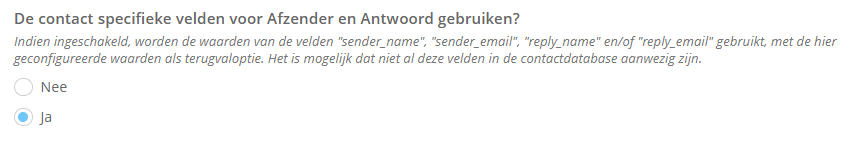 Voorheen werden deze velden altijd gebruikt wanneer ze aanwezig waren. Je kunt nu per mailing kiezen of je deze contactvelden gebruikt of de standaard afzenderinstellingen.
