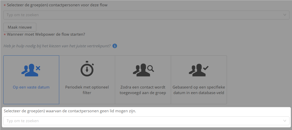Er is een “Niet in groep” optie toegevoegd aan flow start stappen. Hiermee kun je contacten al vóór de start van de flow uitsluiten.