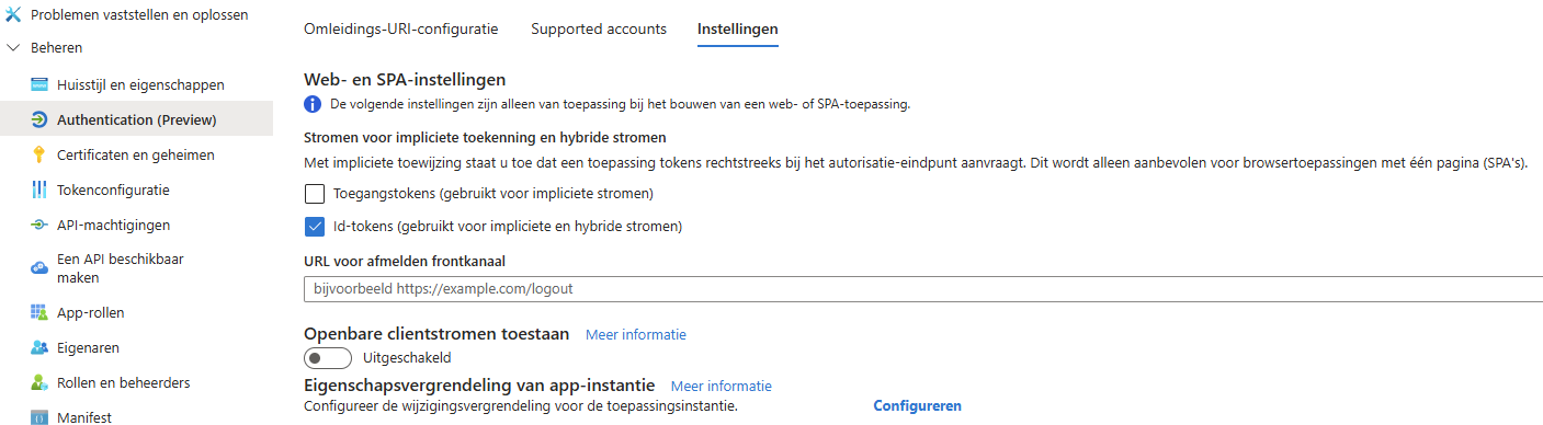 Selecteer onder Stromen voor impliciete toekenning en hybride stromen het selectievakje voor ID-tokens, gebruikt voor impliciete en hybride stromen.