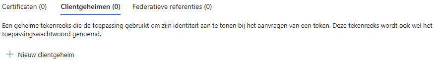 Klik in het menu op Certificaten en geheimen, ga naar het tabblad Client secrets en klik op + Nieuw client secret.