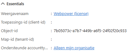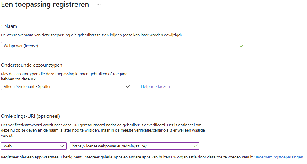 - Redirect-URI: maak een redirect-URI aan voor een webplatform in het formaat: https://[licentie].webpower.eu/admin/azure/
